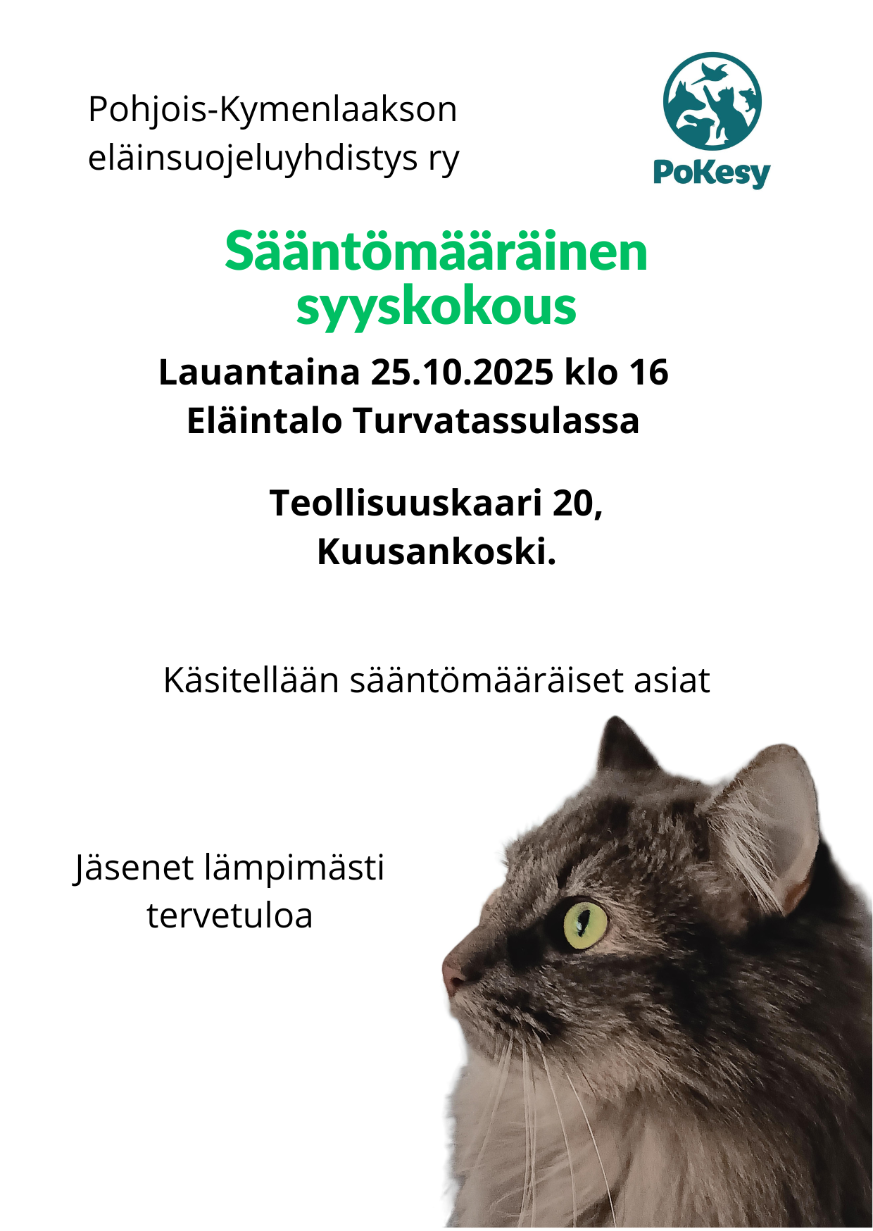 Kotihoitajana huolehdit PoKesyn eläimestä ja tarjoat sille tilapäisen kodin. Hoidat ja ruokit eläintä sille lajityypilliseen tapaan, huomioiden turvallisuusnäkökohdat. Mahdolliset eläinlääkärikäynnit ja muut kuljetukset sovitaan aina erikseen. PoKesy maksaa eläimestä aiheutuvat kulut, esim. ruoka, kissanhiekka ja mahdolliset lääkkeet, kuitteja vastaan. Eläimestä tehdään aina kirjallinen kotihoitosopimus ja ohjeita voit aina kysyä PoKesyn hallituslaisilta. Kun eläin on valmis uuteen kotiin, voit markkinoida sitä yhdessä PoKesyn kanssa. Kysy rohkeasti lisää.